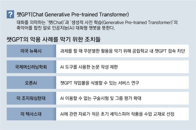 ผ๋ฌธ์ ์ฐ๋ ๊ฒฝ์ฐ๊ฐ ๋์ ๋ด์์๋ 5์ผ(ํ์ง ์๊ฐ) ๊ณต๋ฆฝ ์ค๊ณ ๋ฑํ๊ต ํ์๋ค์ด ์ฑGPT๋ฅผ ์ด์ฉํ์ง ๋ชปํ๋๋ก ๊ต๋ด ๋คํธ์ํฌ๋ฅผ ํตํ ์ฑGPT ์ ๊ทผ์ ์ฐจ๋จํ๋ค. AP ๋ด์์ค
