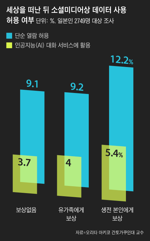 ๋ฏธ๋์ด์ ๋จ๊ธด ๊ธ์ ํ์ฉํด ์ธ์์ ๋ ๋ ๊ฐ์กฑ์ด๋ ์ฐ์ธ๊ณผ ๋ํ๋ฅผ ์๋ํ๋ ์ฌ๋ก๋ ๋์ค๊ณ ์๋ค. ๋ฐ์ค๋ด(Deathbots) ํน์ ์๋๋ด(Thanabots)์ด๋ผ ๋ถ๋ฆฌ๋ AI ์ฑ๋ด์ด ๋ฑ์ฅํ ๊ฒ์ด๋ค.