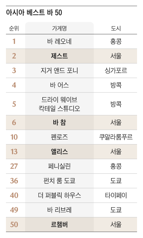 โ๋ฐ ์ฐธ(Bar Cham)โ์ด 6์, โ์จ๋ฆฌ์ค(Alice)โ๊ฐ 13์, โ๋ฅด์ฑ๋ฒ(Le Chamber)โ๊ฐ 50์์ ์ฌ๋ผ ํ๊ตญ ์นตํ